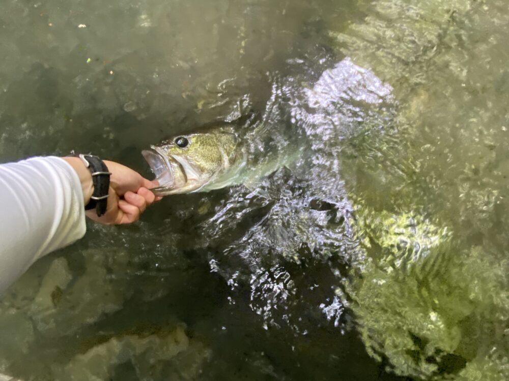 でっか‼ 自己ベストタイとなる56㎝のモンスターバスです。見えていたので大きいのは分かっていたのですが、あげてみると思ったより大きかったです。見つけてから釣り上げるまでの一連が丸見えだったので、心臓バクバクで大興奮のひと時でした。